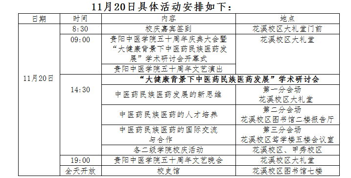 2015年11月20日 ,贵阳中医学院将迎来50华诞。自发布校庆一号公告以来,校庆工作得到广泛支持,全面有序推进。目前,贵阳中医学院50周年校庆在“学术会友,以庆促建”原则指导下,已确定校庆当日活动安排。在此,我们再次发出诚挚邀请,热忱欢迎各级领导、各界朋友及全体校友拔冗亲临。