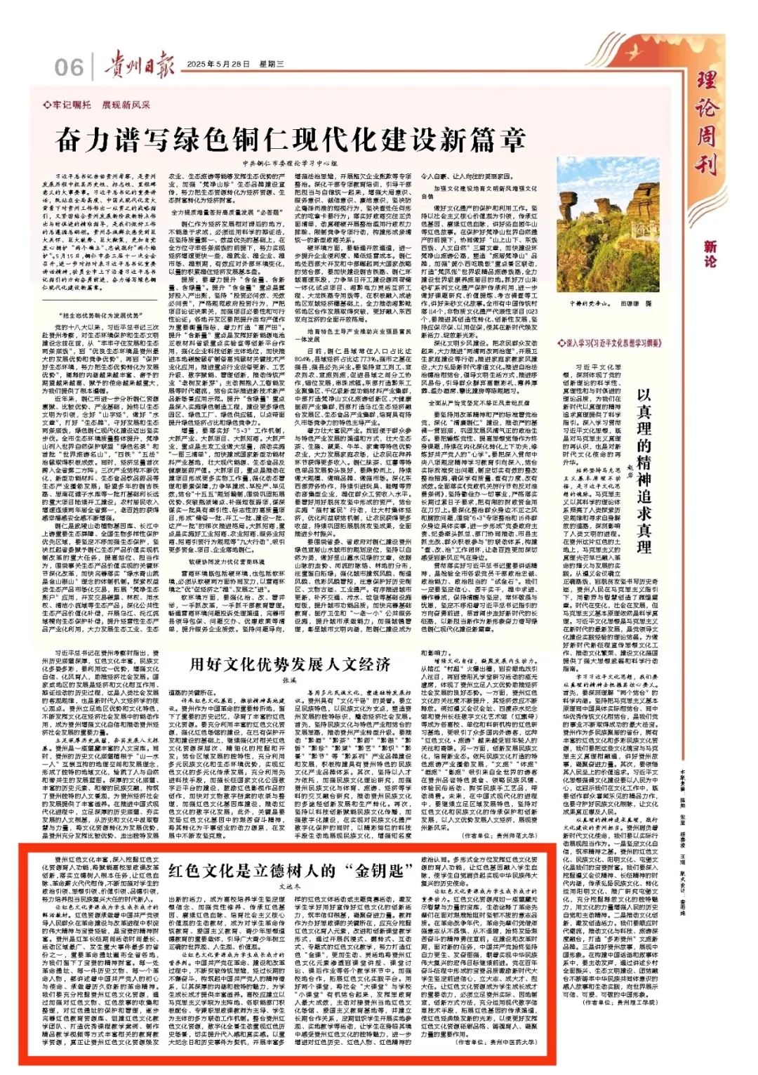 5月28日,《贵州日报》在“理论版”刊发我校马克思主义学院教师文远冬署名文章《红色文化是立德树人的“金钥匙”》。