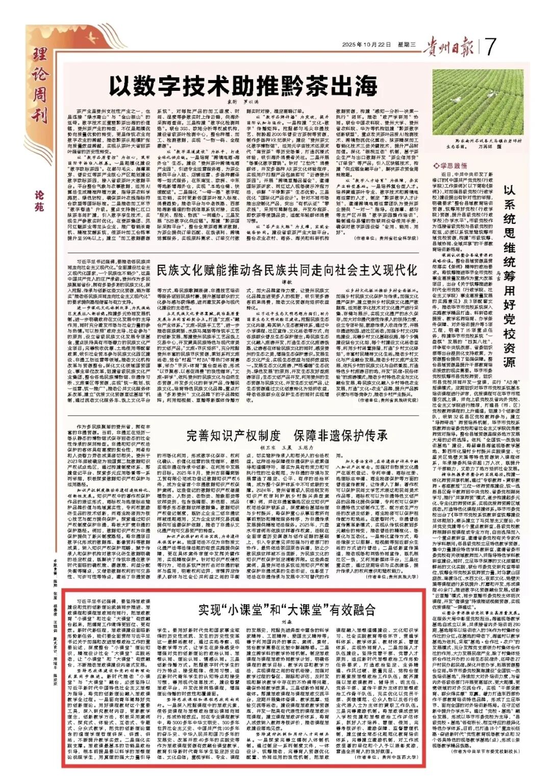 10月22日,《贵州日报》在“理论周刊”刊发我校马克思主义学院教师刘淼署名文章《实现“小课堂”和“大课堂”有效融合》。
