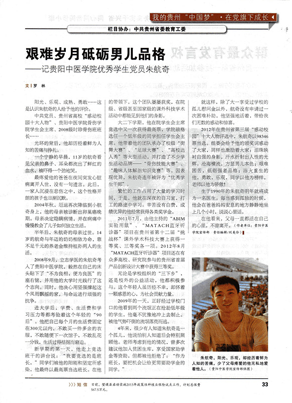 首页 首页 上一篇:【西部开发报】贵阳中医学院产学研合作模式助推民... 下一篇:【贵州日报】“温暖工程”温暖贫困学子 【当代贵州】艰难岁月砥砺男儿品格——记贵阳中医学院优秀学生党员朱航奇 2013.09.22 15:03:19 宣传部