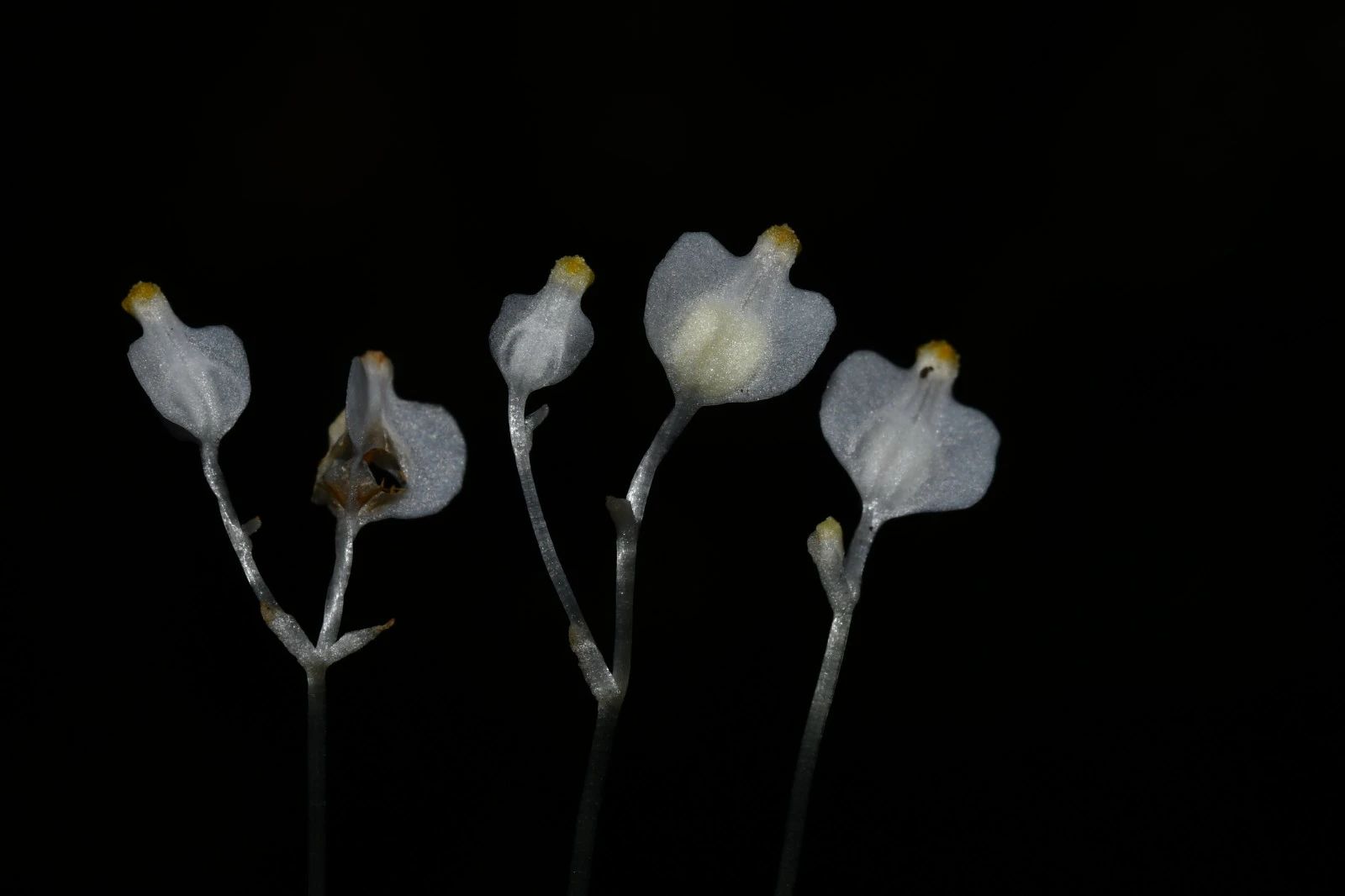 仅有1~2朵花生于茎顶,直立,具短梗;翅显著,白色;外轮花被裂片三角状椭圆形,长0.5~1.5毫米,内轮花被裂片较小;药隔顶端具叉开的鸡冠状附属体,基部有垂悬的距;子房近球形,长1~2毫米。