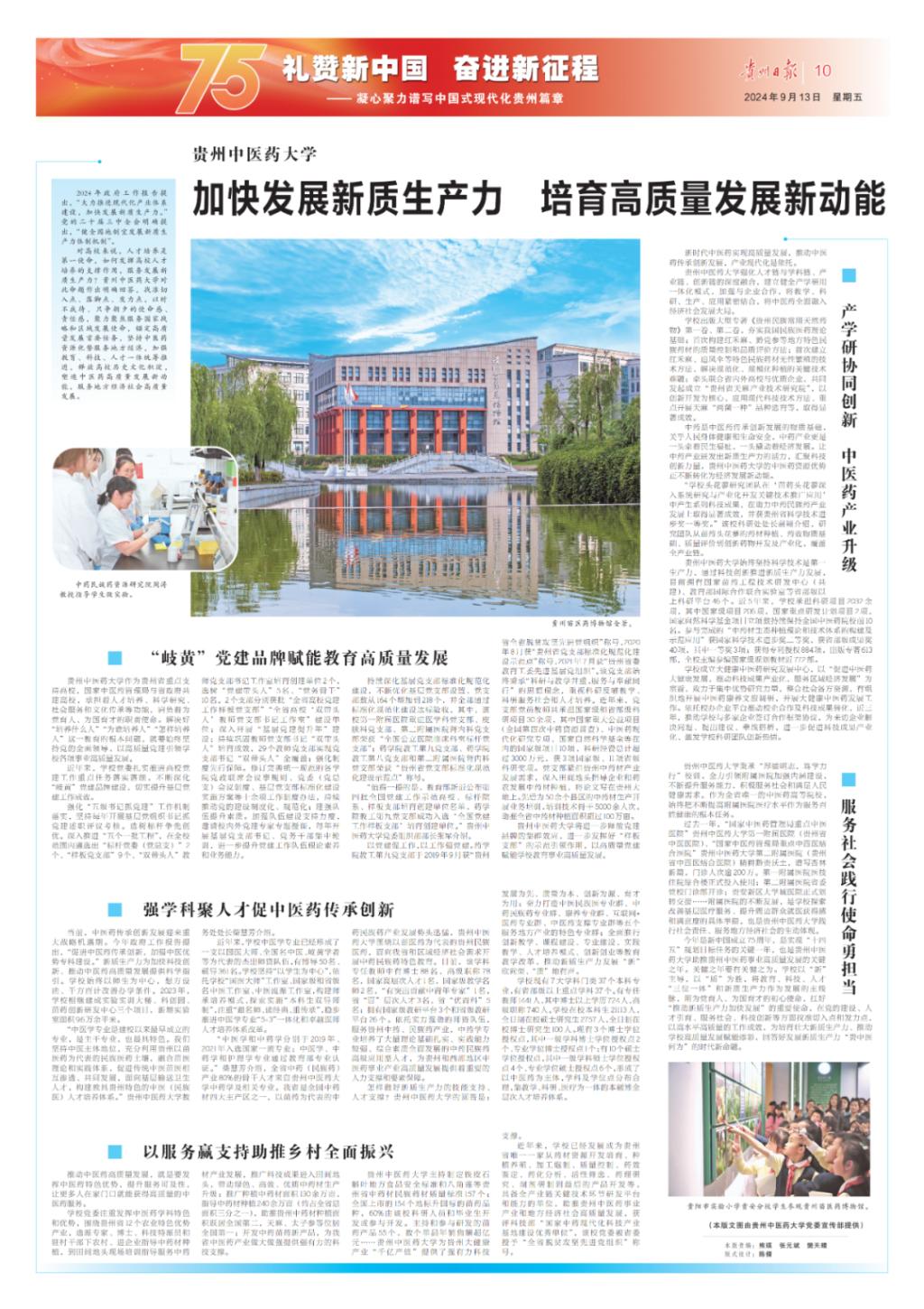 近年来,学校已经发展成为贵州省唯一一家从药材资源开发培育、种植养殖、加工炮制、质量控制、药效鉴定、药化分析、活性筛选、药理研究、制剂研制到最后的产品开发等,具备全产业链关键技术环节研发平台和能力的单位,助推贵州中医药事业产业和地方经济社会高质量发展,获评科技部“国家中药现代化科技产业基地建设优秀单位”,该校党委被省委授予“全省脱贫攻坚先进党组织”称号。