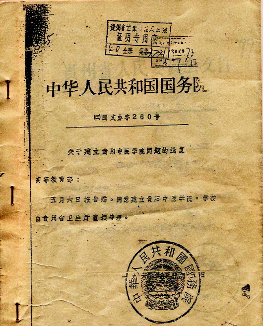 1965年初,由部分著名老中医共同提出的"创建贵阳中医学院"的建议,引起贵州省委省政府、卫生部、教育部的高度重视并获得支持。在毛泽东主席、周恩来总理的关怀下,当年,经国务院批准,贵州省历史上第一所中医药高等学府创立。