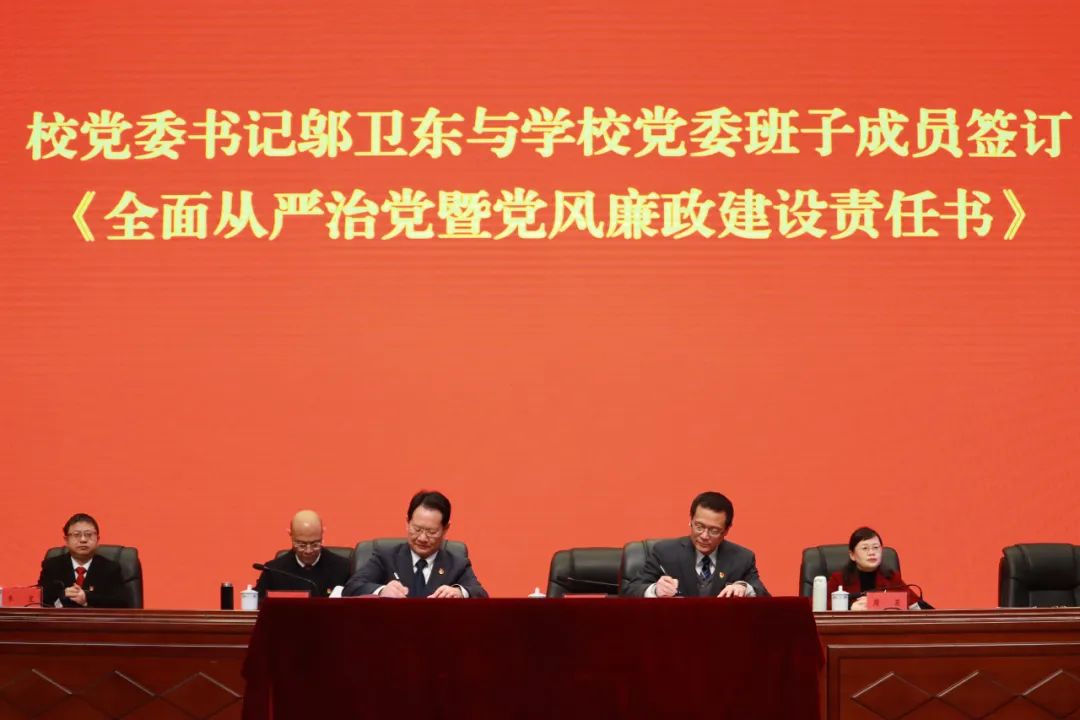 会上,邬卫东与校党委班子成员、校党委班子成员与部门及二级党组织代表分别签订全面从严治党暨党风廉政建设责任书。