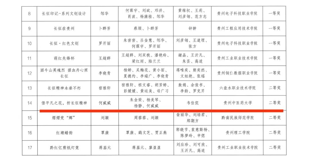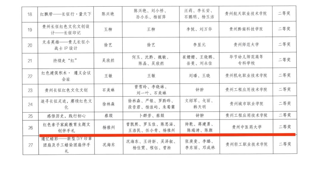 日前,由省委宣传部、省委教育工委、省教育厅和省文化和旅游厅组织开展的薪火黔行——“辉映红飘带·传承长征魂”红色文创设计大赛评审结果公布。经个人申报、学校初评及推荐、省赛专家评审等环节,我校学子斩获4个奖项。