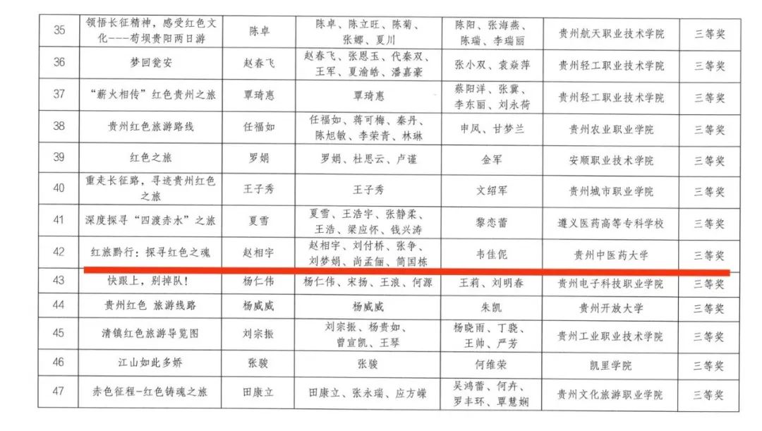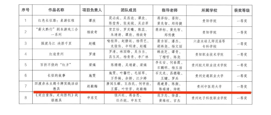 其中,赵毅梅、唐闻玉麒、王浩民、何宇欣、王露、叶世芳团队作品《四渡赤水主题卡牌实践活动教具》荣获“伟大征程”红色实践活动教具赛道一等奖,蒋建勇、陈颜、陈瑞清、帅乾获评优秀指导老师;何威威、朱金荣、杨美琴、杨静团队作品《借平凡之花,析长征精神》,杨雅州、曾凯熙、罗玉佳、陈思涵、王浩民、任小青团队作品《红色亲子家庭教育主题文创伴手礼》分别荣获“红飘带”红色文创伴手礼赛道二等奖,韦佳伲,帅乾、蒋建勇、陈瑞清、陈颜获评优秀指导老师;赵相宇、刘付桥、张争、刘梦娟、尚孟俪、简国栋团队作品《红旅黔行:探寻红色之魂》荣获“多彩贵州”红色旅游路线设计赛道三等奖。