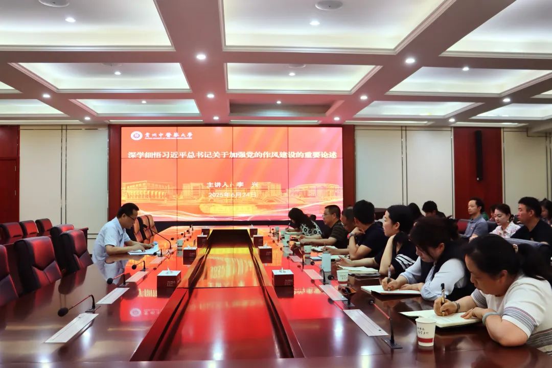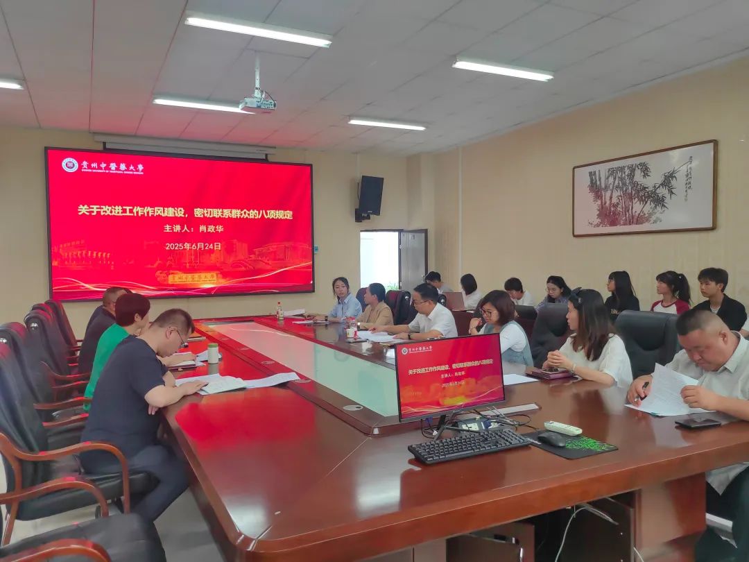 校领导要求,要强化责任担当,扛牢作风建设主体责任,持续拧紧责任链条、凝聚严管严治合力,确保学习教育持续走深走实,取得实效。要深化学习教育,将中央八项规定精神内化于心、外化于行,以作风建设新成效赋能教育强国、特色教育强省建设。要持续改进作风,将改进作风融入思想、工作、学习、生活的各个方面、各个环节,系好人生的“风纪扣”,以优良作风凝心聚力、干事创业,营造清正廉洁、奋发有为的校园氛围。