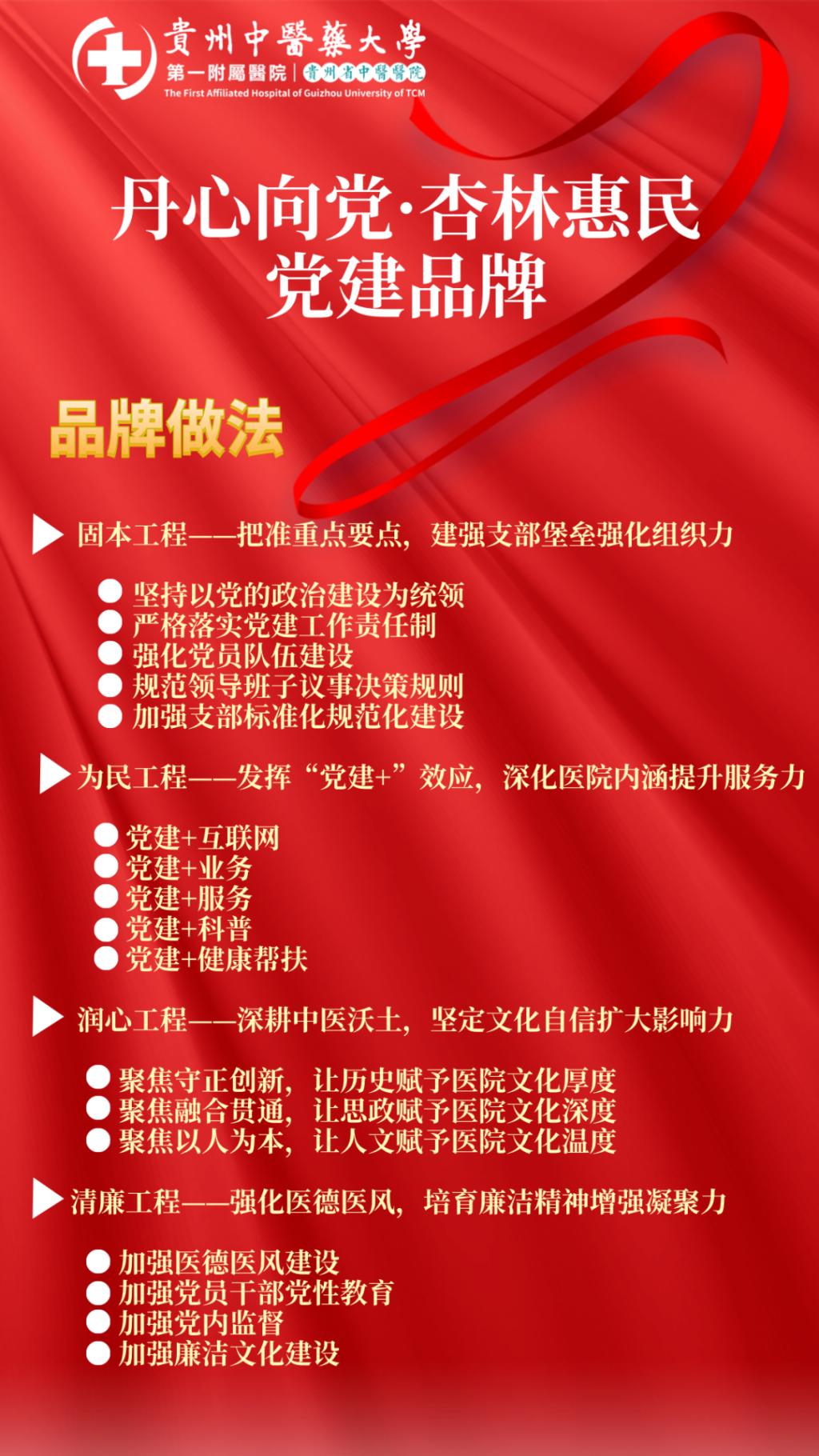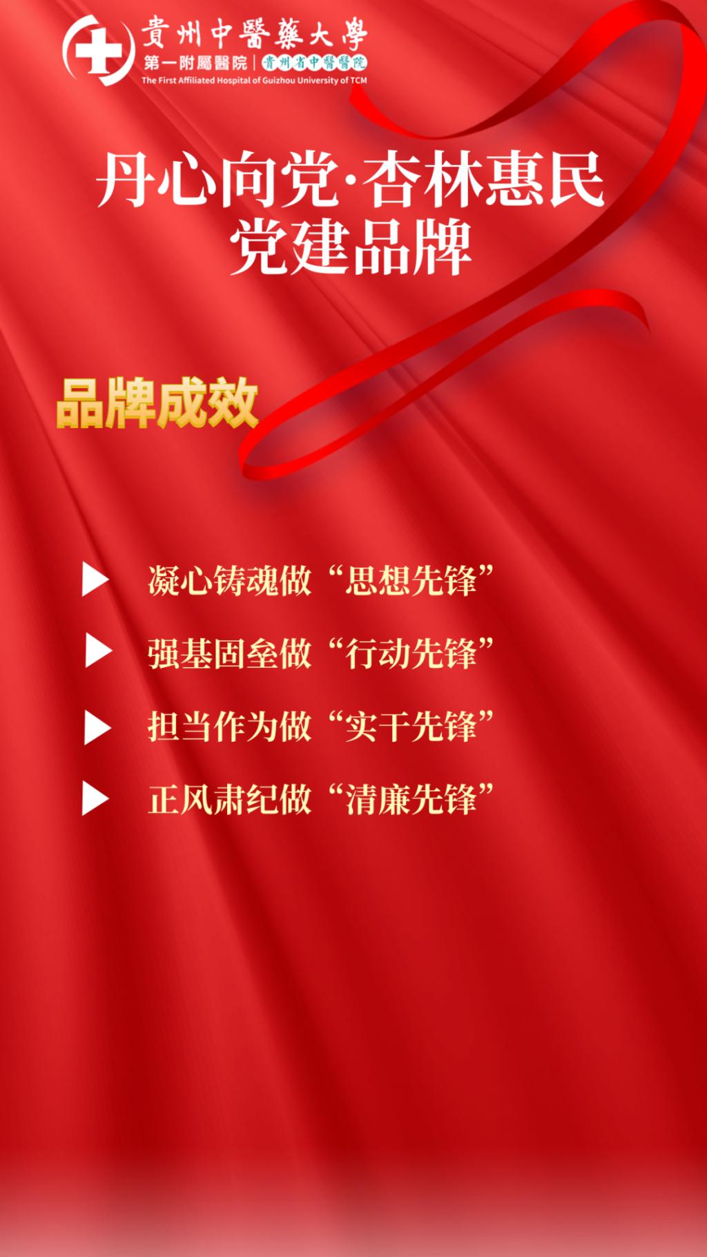 近年来,一附院围绕“黔进前锋·贵在行动”总载体,以落实“三心两强”五项行动为抓手,积极打造“丹心向党·杏林惠民”党建品牌,充分发挥党建品牌的引导、激励、保障作用,把组织资源转化为发展资源,把组织优势转化为发展优势,把组织活力转化为发展活力,充分调动基层党支部和广大党员担当作为、干事创业、创先争优、拼搏奉献的积极性和主动性,为推动医院高质量发展提供了坚实保障。