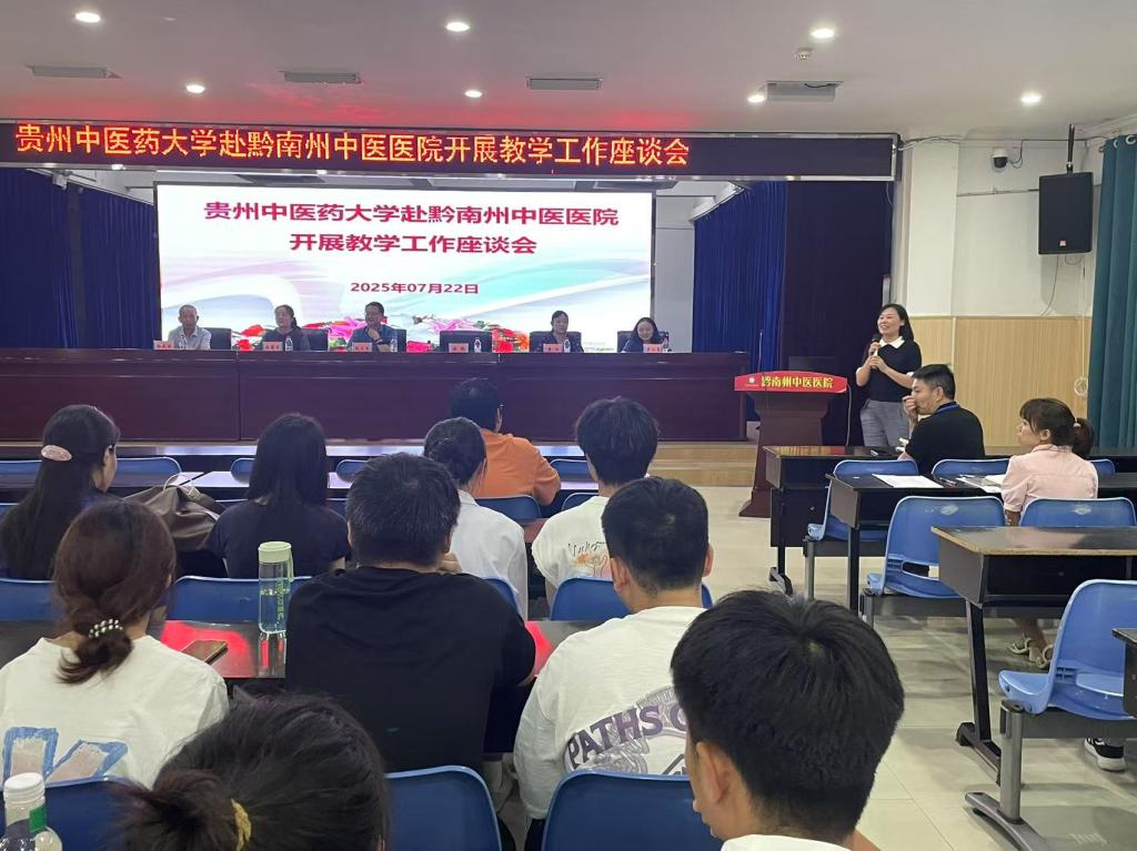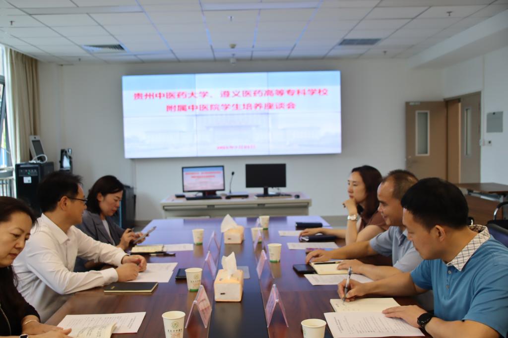 在遵义市中医院,听取了院党委书记杨跃岚、副院长孔维军及科教部团队关于研究生培养、实习生管理工作专项汇报,系统了解了医院在教学改革、带教规范等方面的实践经验介绍。双方围绕实习考核评价机制、临床思维培养路径等议题展开详细交流,并对教学中存在的难点痛点问题进行了深入交流。