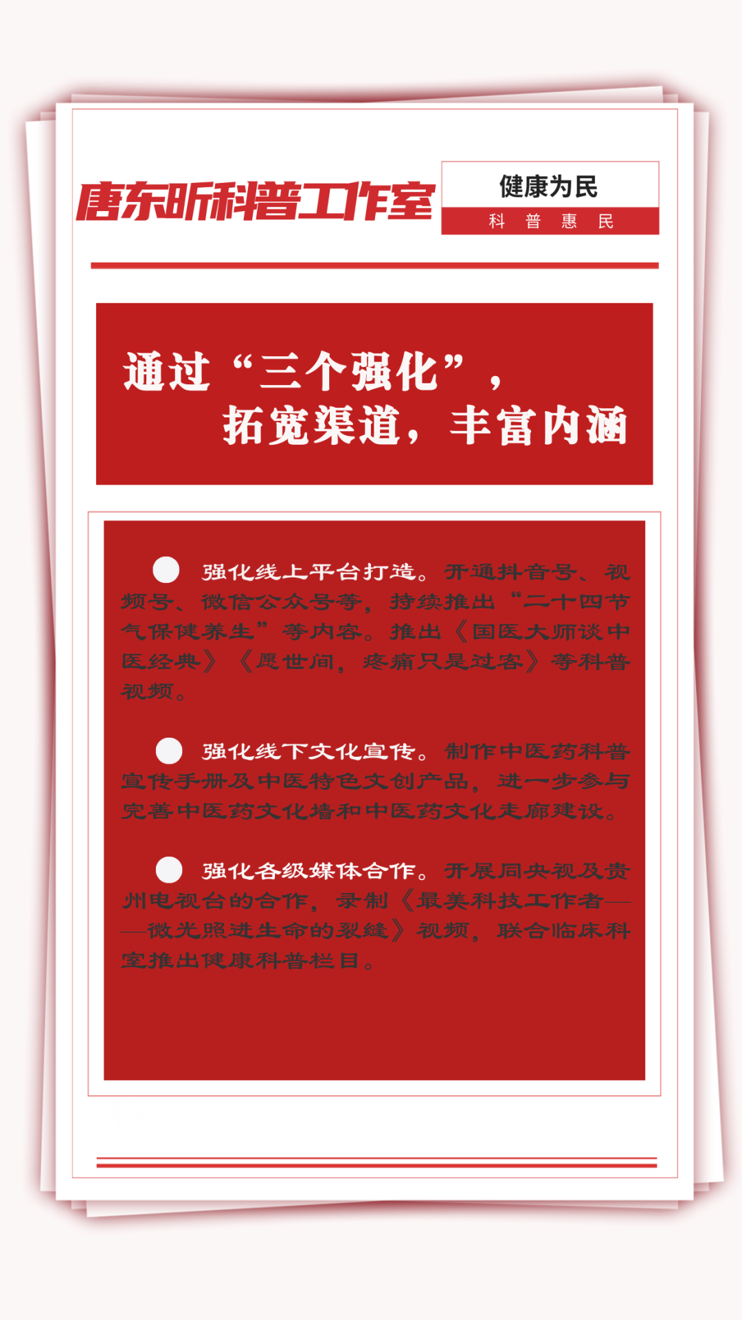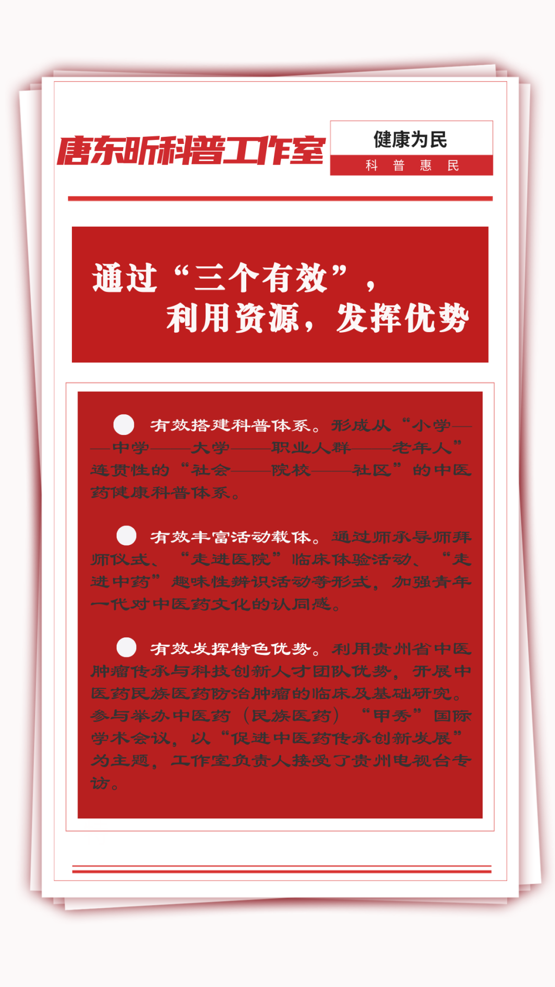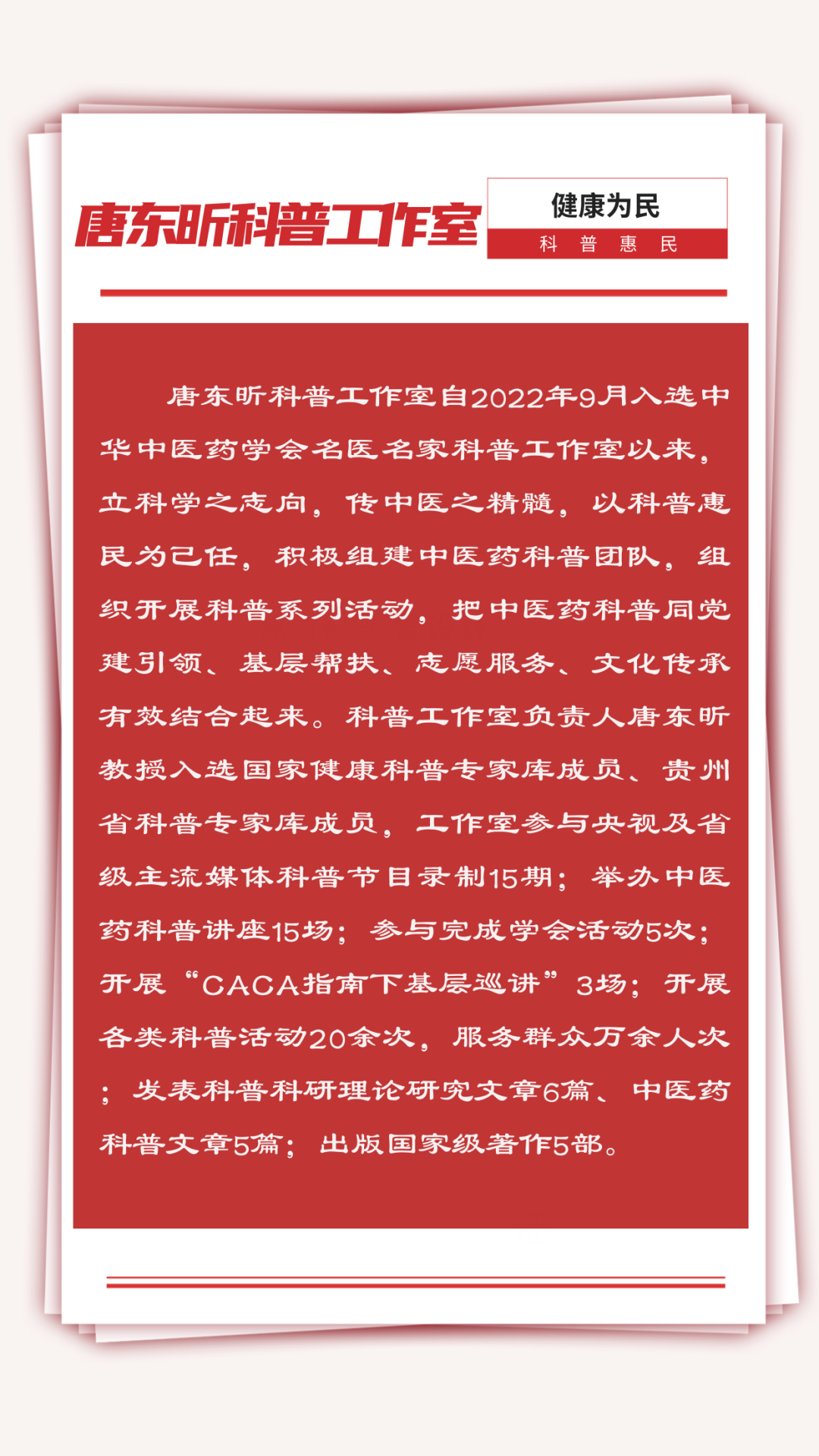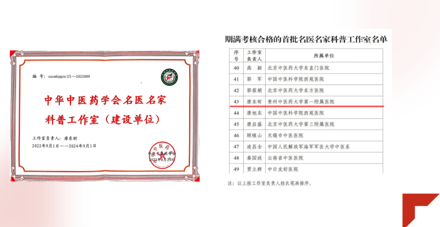 今年3月,唐东昕科普工作室顺利通过首批名医名家科普工作室期满考核。此次入选是工作室继2022年获评“中华中医药学会名医名家首批科普工作室”后,再度获得学会认可,获得的又一殊荣。近年来,在唐东昕教授带领下,工作室持续深耕科普领域,弘扬中医药文化,传播中医药知识,取得显著成效。
