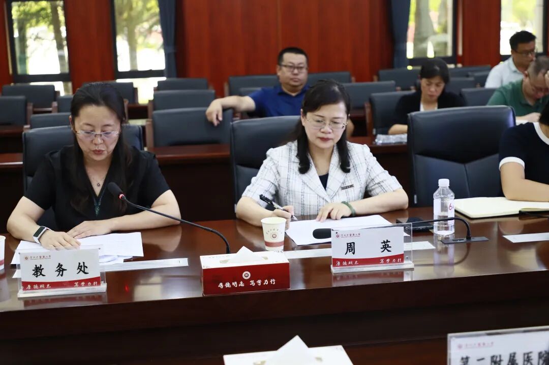 校长周英出席会议并讲话。学校两所直属附属医院、5所非直属附属医院、两所教学医院分管教学副院长及医(科)教科同志;教务处、学工部、针灸推拿学院、中医养生学院、骨伤学院、护理学院负责人及相关科室负责同志参加。
