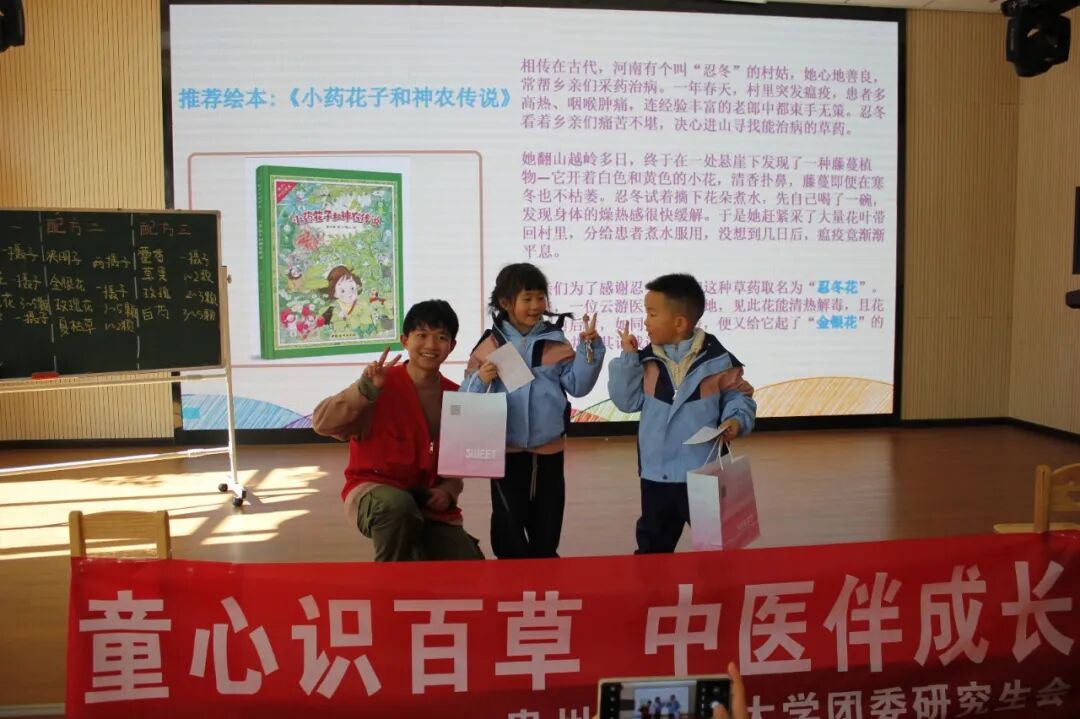 随后,志愿者带领小朋友阅读中医药启蒙绘本《小药花子和神农传说》,通过屠呦呦与青蒿素的故事,激发其对中医药科学的好奇与向往。