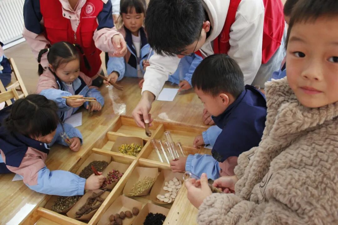 在闻香瓶制作环节,经志愿者“一对一”指导,小朋友们化身“小小药剂师”,用镊子小心翼翼地选取药材,按照不同功效配方,将它们装入玻璃试管中,制作出独一无二、可看可闻可摇的专属闻香瓶。现场气氛热烈,大家兴致盎然。