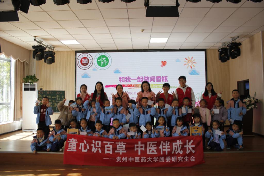 11月24日,校研究生会“岐黄育苗”志愿服务队走进花溪区美的国宾府幼儿园,开展以趣味手工“中药闻香瓶”制作为主题的中医药文化启蒙小课堂活动,并向小朋友赠送研究生会文创产品“研宝”小夜灯。