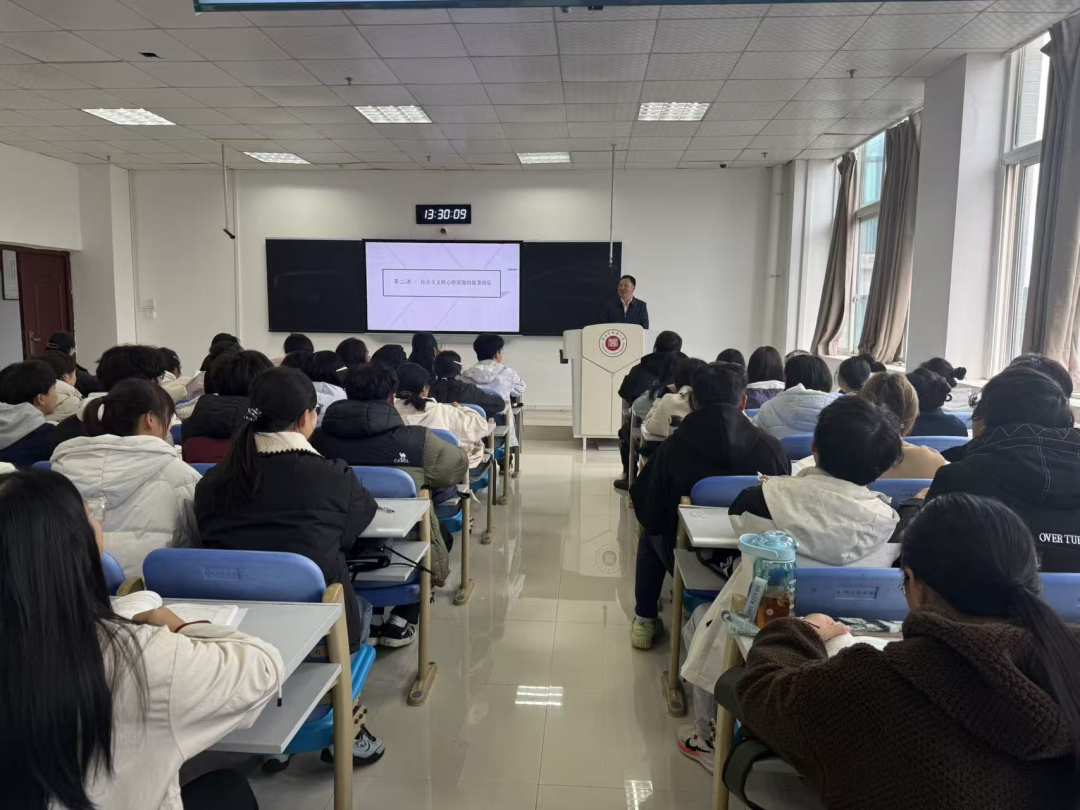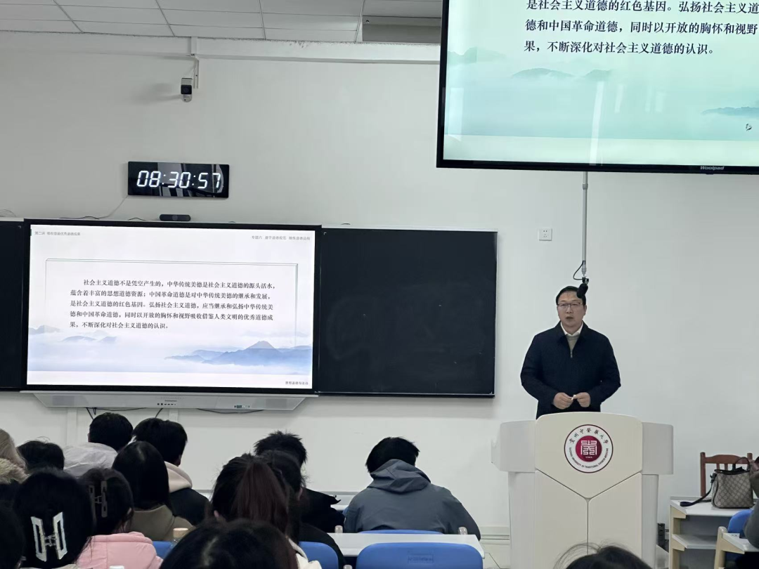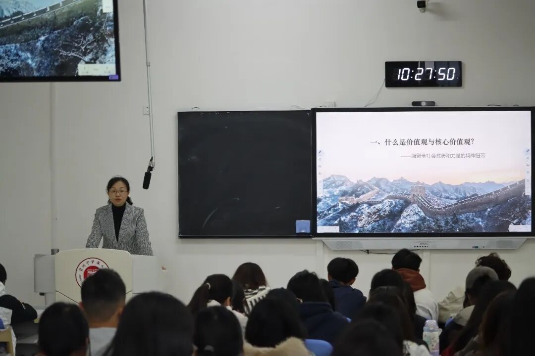 明雪梅为中医养生学院食品营养与健康专业2025班授课,从理论与实践、历史与现实的角度作阐述,希望同学们努力做社会主义核心价值观的坚定信仰者、积极传播者和模范践行者。