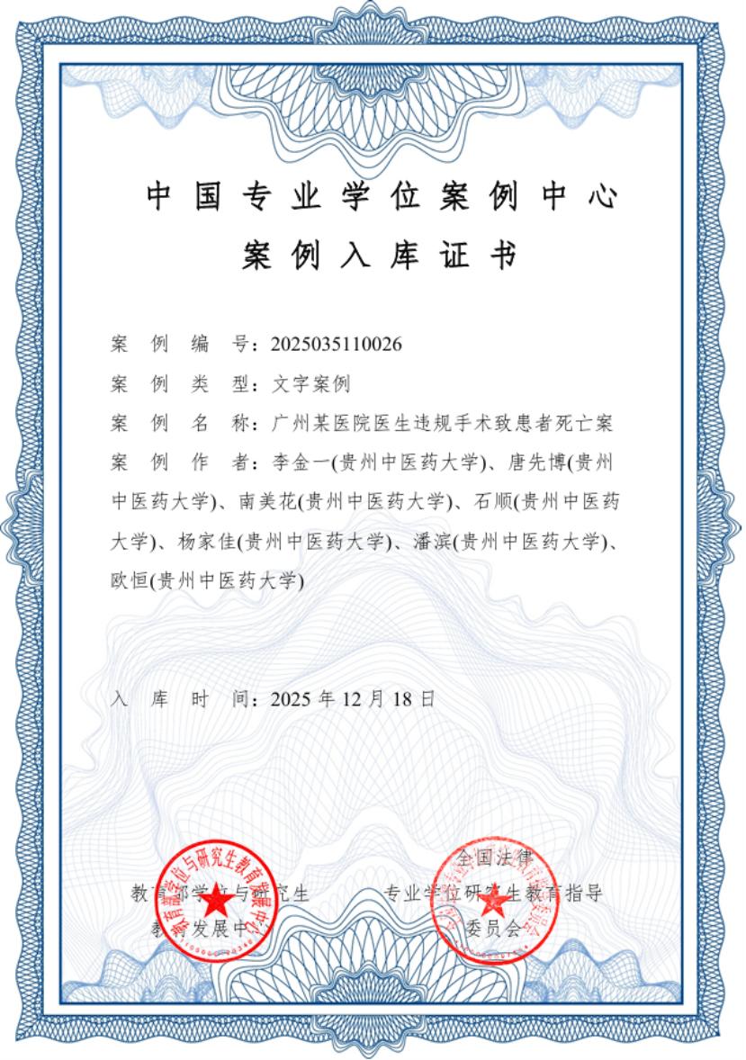 近日,从中国专业学位案例中心传来喜讯:由我校李金一老师团队编写的专业学位教学案例《广州某医院医生违规手术致患者死亡案》通过评审,被该中心收录入库。这是我校法律硕士专业学位点自2021年获批以来,首次有案例入选国家级案例中心,也是贵州省法律硕士培养高校中为数不多的入库案例之一,标志着我校在法律硕士案例教学建设领域实现较大突破。