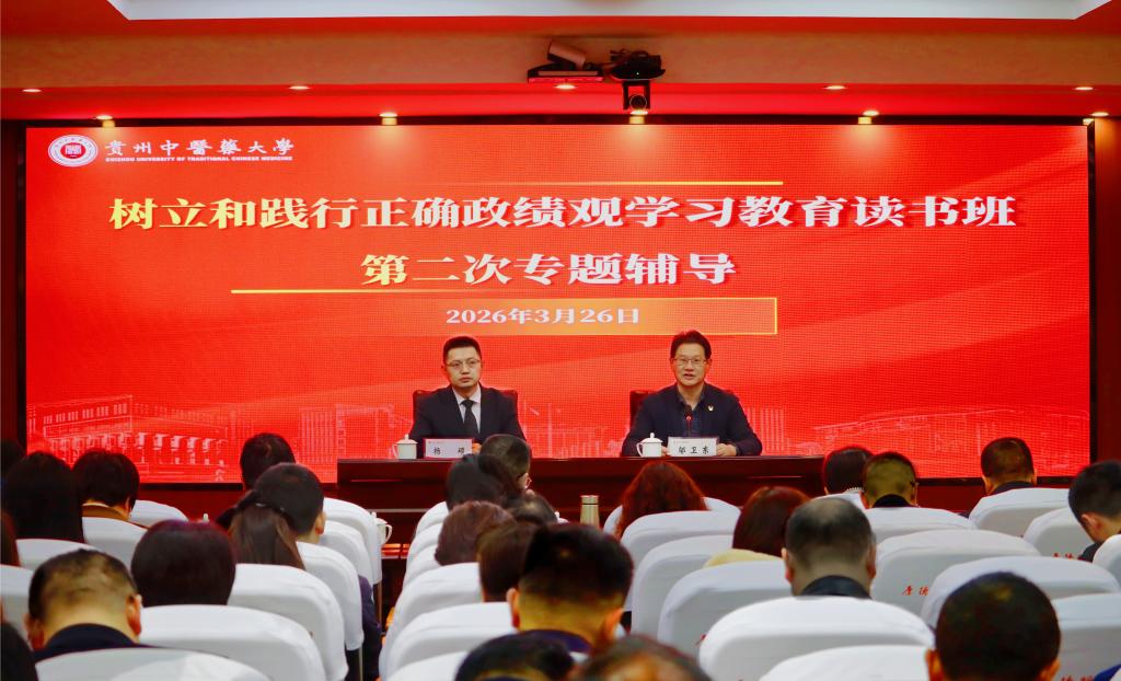 3月26日上午,学校在花溪校区行政楼会议室举办树立和践行正确政绩观学习教育读书班第二次专题辅导报告会,集中学习全国两会精神,深入学习贯彻习近平总书记关于树立和践行正确政绩观的重要论述,引导党员干部坚持人民至上、践行师生至上,进一步坚定理想信念、厚植为民情怀、砥砺实干担当,推动正确政绩观内化于心、外化于行,凝心聚力建设“国内一流、特色鲜明的综合性创新型中医药大学 ”,努力创造经得起实践、人民、历史检验的实绩。