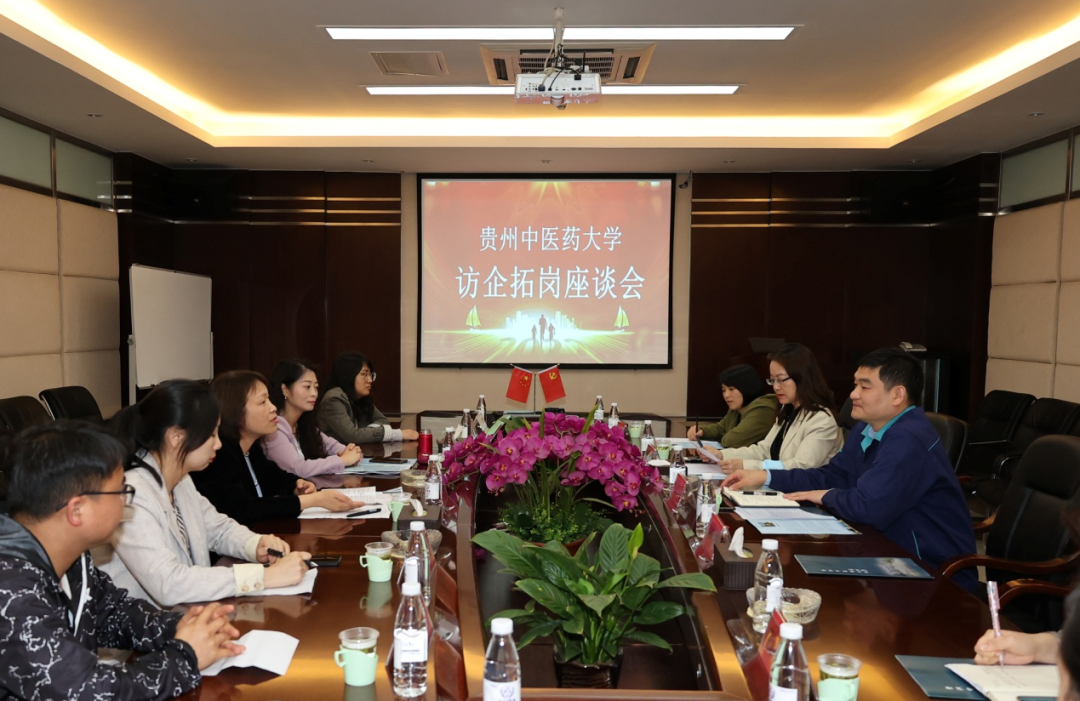 在与贵州科伦药业有限公司、贵州圣济堂药业有限公司、贵州科辉制药有限责任公司、贵州道地药业有限公司、明远药业有限公司等医药企业负责人座谈交流时,滕红介绍了我校办学历史、办学规模、专业设置、人才培养等基本情况,近年来在人才培养、科技成果转化等方面取得的成效以及我校2022届毕业生情况与就业需求等。