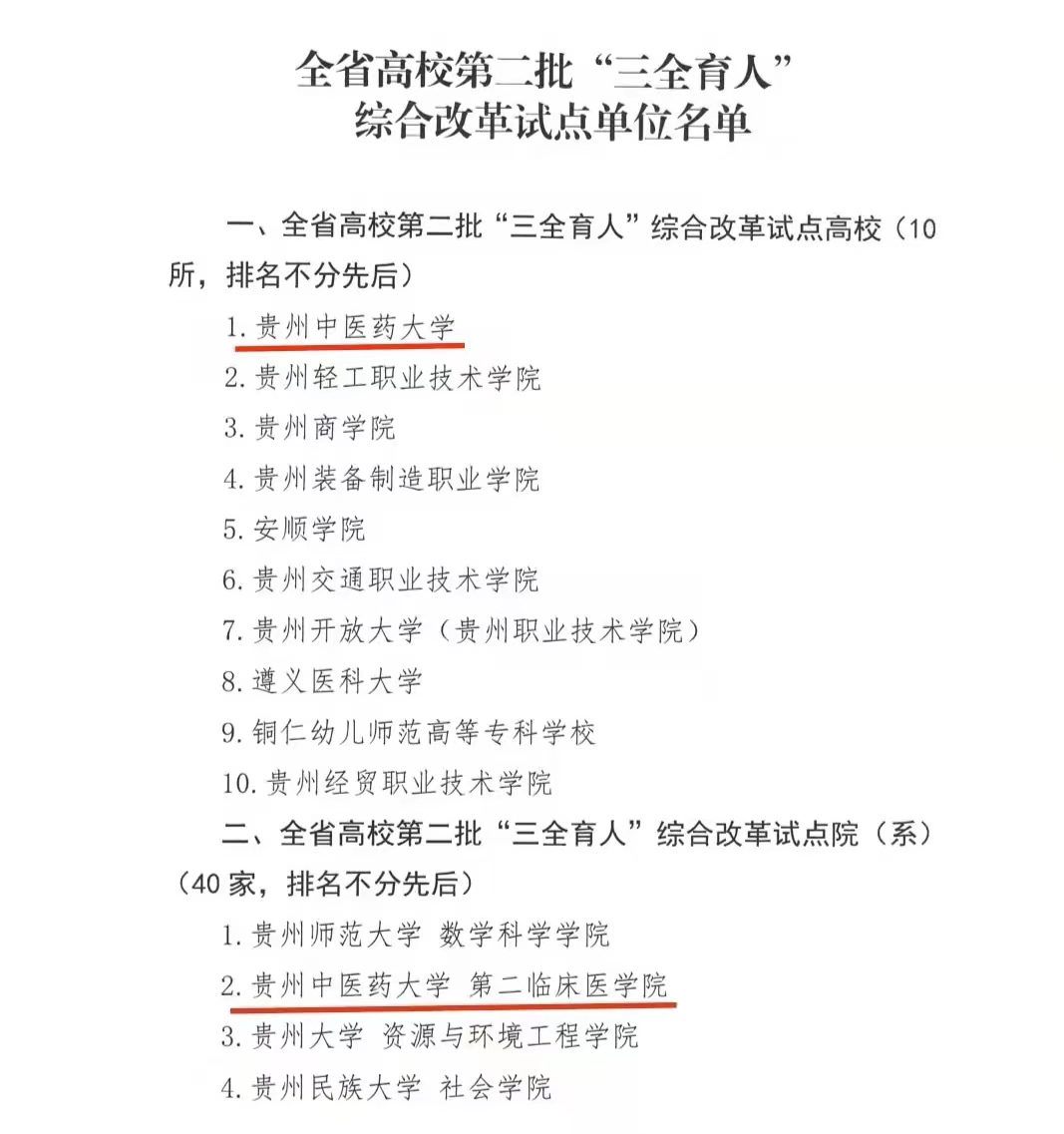 近日,省教育厅公布贵州省高校第二批“三全育人”综合改革试点单位名单,经报送单位推荐、网络评审、现场评审和厅党组会审核通过,我校入选全省高校第二批“三全育人”综合改革试点单位,我校第二临床医学院入选全省高校第二批“三全育人”综合改革试点院。