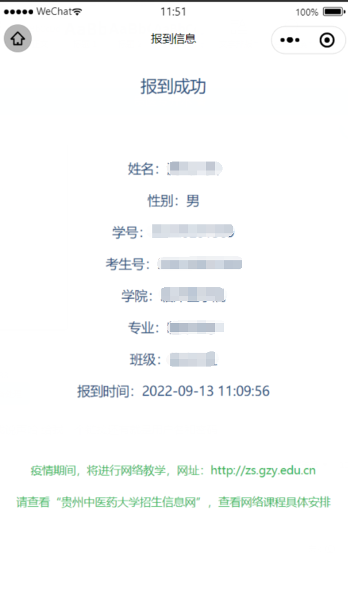 4、提交后等待学校审核确认,确认结果通过短信提示,再次进入小程序,查看报到信息。
