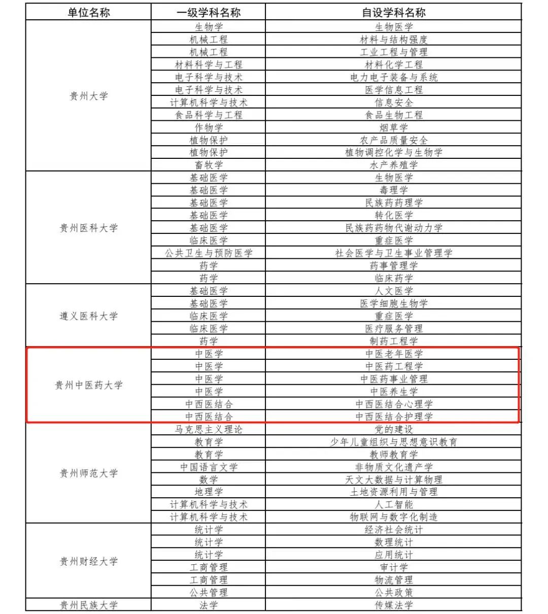 学校新闻 最新动态> 通知公告> 专项工作> 媒体关注> 学校新闻 最新动态 通知公告 专项工作 媒体关注 上一篇:2296名!出席中国共产党第二十次全国代表大会代表... 下一篇:刘兴德与参与疫情防控教职工“云端”谈心 贵中医入选!教育部公布最新二级学科名单 2022.09.17 22:14:27 教育部官网 近日,教育部公布最新学位授予单位(不含军队单位)自主设置二级学科名单(共5185个)。其中,贵州有7所,365英国上市公司(集团)官方网站在列,分别是中医老年医学、中医药工程学、中医药事业管理、中医养生学、中西医结合心理学、中西医结合护理学6个自设二级学科。