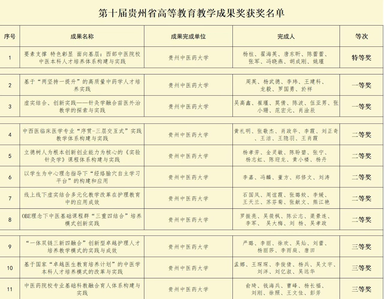 近年来,学校立足办学特色优势,持续优化学科专业布局,深化教育教学改革,守正创新、踔厉奋发,经过长期探索实践,不断形成独具贵中医特色、具有推广应用价值的优秀成果。今后,我校将继续深化本科教育教学改革,强化实践运用,积极为提高人才培养能力、服务地方经济社会、促进中医药传承和创新发展贡献贵中医力量。