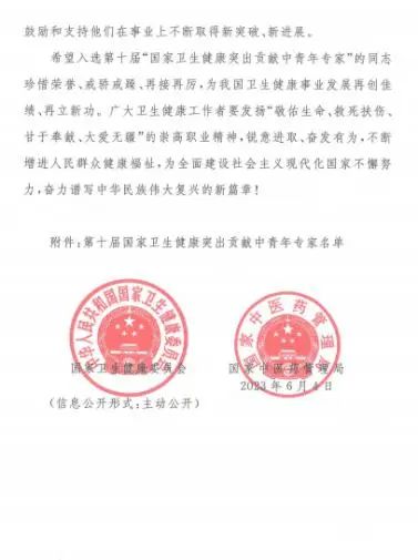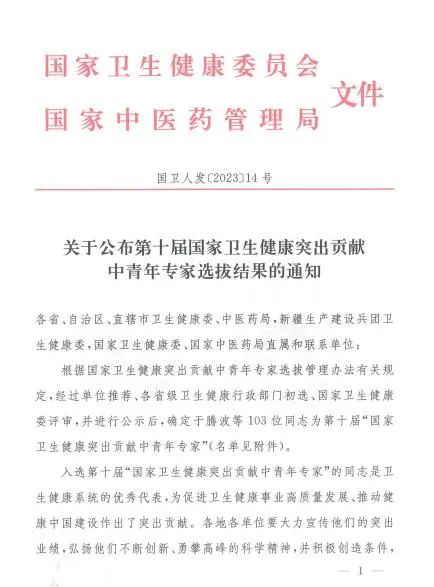 “国家卫生健康突出贡献中青年专家”每两年组织选拔一次,是国家医药卫生领域中的顶级人才称号。此次全国103名入选者均为卫生健康系统的优秀代表,为促进卫生健康事业高质量发展、推动健康中国建设作出了突出贡献。
