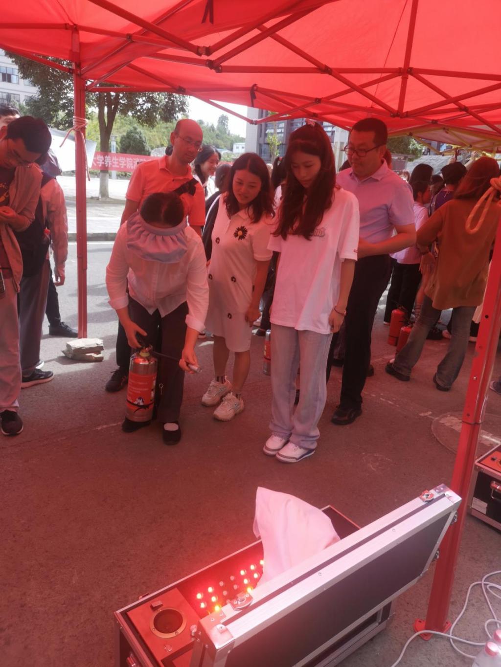 培训结束后,中医养生学院和中医骨伤学院师生有序前往安全绳使用区、灭火器模拟灭火体验区、模拟烟雾逃生体验区依次分区体验,在工作人员的指导下掌握了扑灭初期火灾的操作技巧及火场逃生要领。