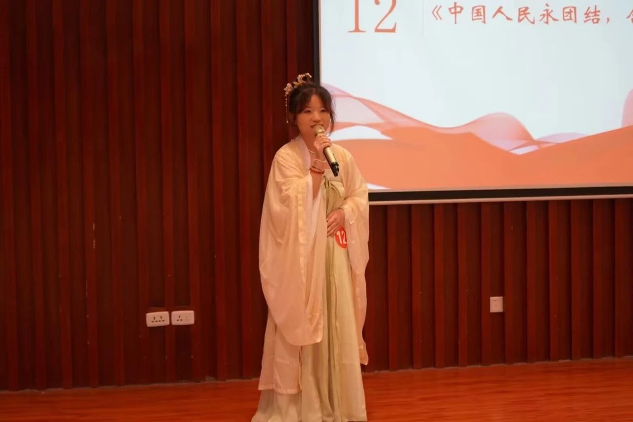 比赛中,参赛选手或结合音乐和PPT,或身着民族服饰讲述民族团结的感人故事,用饱含感情的语言表达了各民族同呼吸、共命运、心连心的浓厚情谊。
