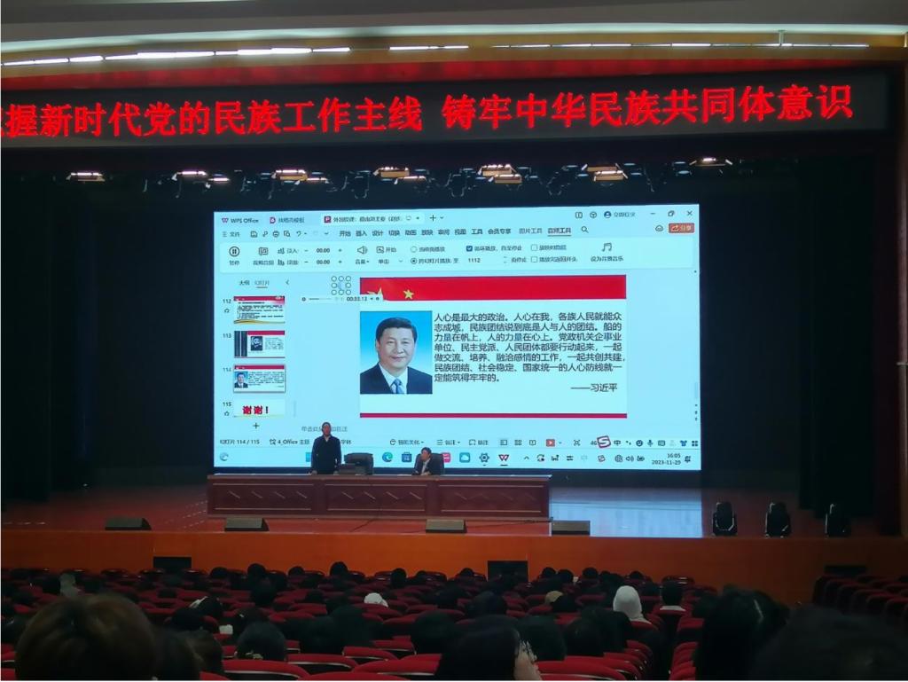 “民族团结国家才能长治久安。我们组织铸牢中华民族共同体意识教育,就是为了增强大家牢固树立正确的国家观、深刻认识国家统一是各民族最高利益,强化共同维护国家统一的思想根基。”党委统战部副部长谢敏主持讲座时讲道。