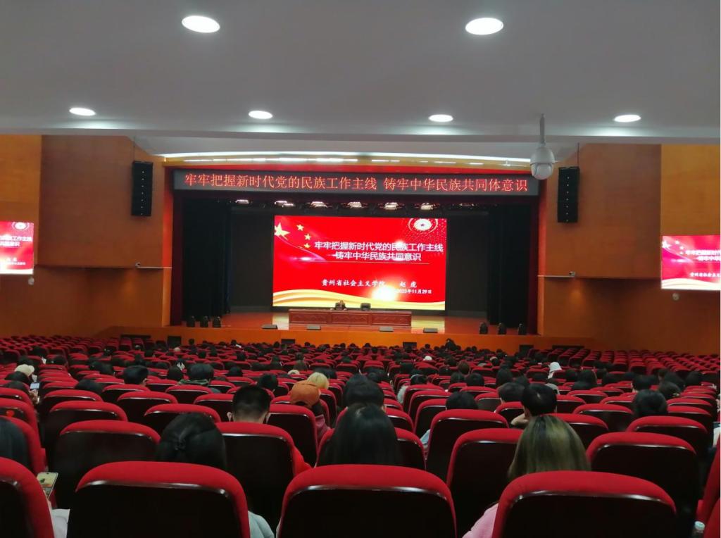 11月29日,学校在花溪校区礼堂举办铸牢中华民族共同体意识专题讲座,邀请省社会主义学院专家赵虎以“牢牢把握新时代党的民族工作主线 铸牢中华民族共同体意识”为题授课。各职能部门,各基层党委(党总支)、直属党支部宣传、统战干部,各学院教师、辅导员及学生代表参加学习。