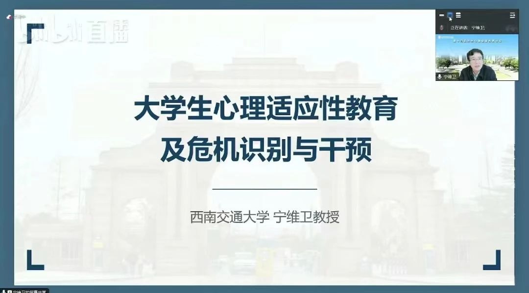 西南交通大学应用心理学研究院院长宁维卫教授受邀以《大学生心理适应性教育及危机识别与干预》作线上讲座。宁维卫从习近平总书记在考察清华大学时勉励新时代青年要“立大志、明大德、成大才、担大任”的谆谆嘱托讲起,强调我们要高度重视大学生成长成才过程中的心理健康问题,及时关注及时、“对症”施策。就大学生入学后可能出现的心理适应方面问题,他对如何做好心理异常群体大学生心理干预和疏导工作给出应对建议。