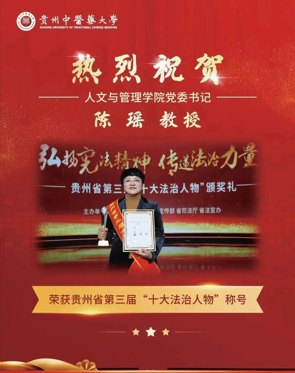 12月4日,正值第十个国家宪法日,2023年贵州省“宪法宣传周”系列活动——第三届“十大法治人物”颁奖礼在贵阳举行。365英国上市公司(集团)官方网站人文与管理学院党委书记陈瑶教授荣获贵州省第三届“十大法治人物”称号。