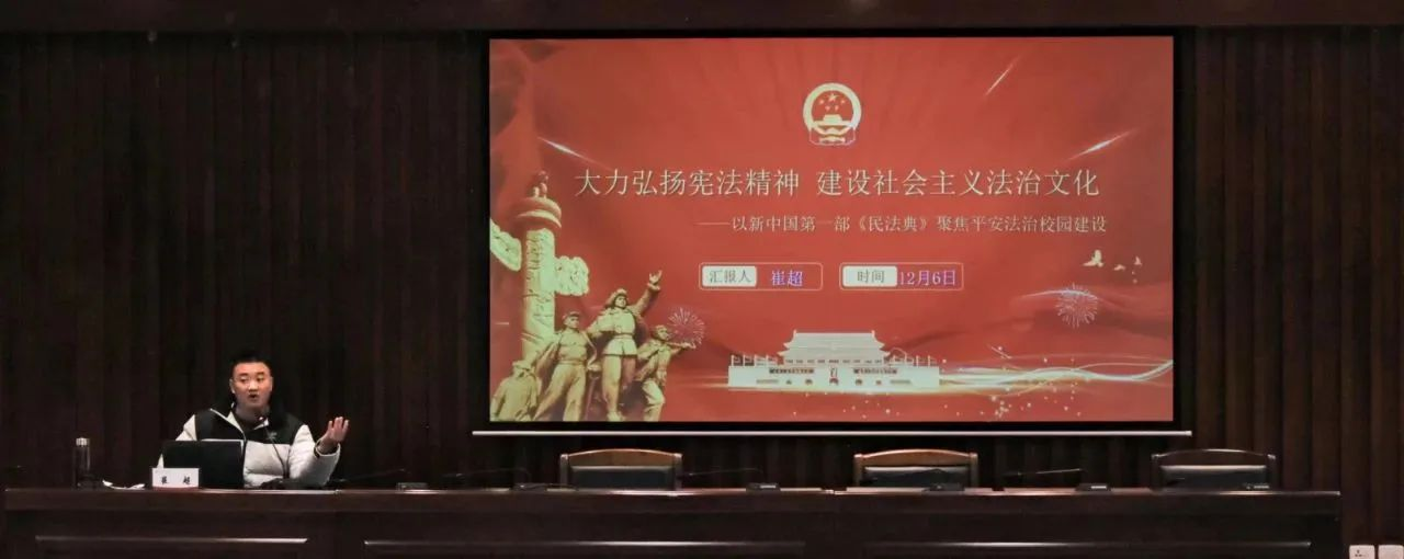 人文与管理学院副教授崔超以《大力弘扬宪法精神 建设社会主义法治文化——以新中国第一部<民法典>聚焦平安法治校园建设》为题,围绕《民法典》的出台背景、重要论述、基本亮点、主要内容、高校实施等方面对《民法典》的概念、构成、体系及基本原则等进行讲解,并结合学校实际,对《民法典》高校实施中的主要法律风险、学生违纪违法犯罪典型案例进行分析,提出高校面对法律风险挑战的防控对策。