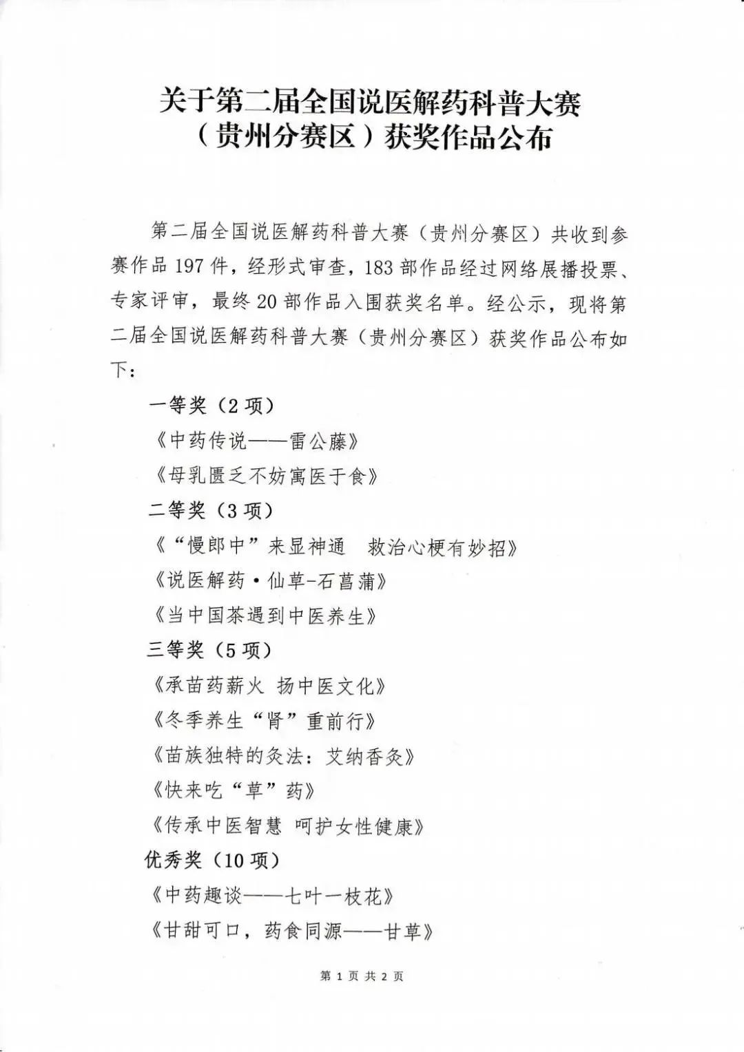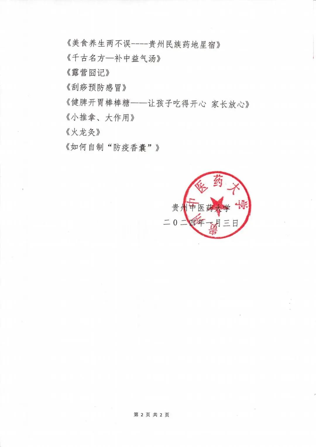 学校新闻 最新动态> 通知公告> 专项工作> 媒体关注> 学校新闻 最新动态 通知公告 专项工作 媒体关注 上一篇:贵州省高校人文社科基地主任联席会议暨全省高等医... 下一篇:省农业农村厅领导来校调研 第二届全国说医解药科普大赛(贵州分赛区)获奖作品公布!这些作品斩获殊荣→ 2024.01.05 13:57:18 科研处