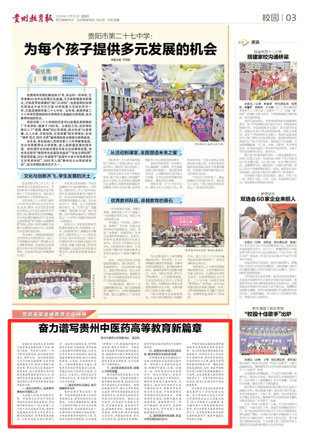 12月20日,《贵州教育报》在“贯彻落实全省教育大会精神”专栏,刊发我校党委书记邬卫东署名文章《奋力谱写贵州中医药高等教育新篇章》。全文如下: