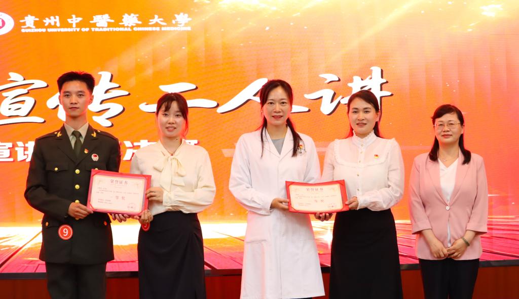 校内外5位评委结合宣讲内容、语言表达、现场效果等对参赛队伍进行综合评分。经过激烈角逐,最终,第二附属医院(第二临床医学院)舒梦月、冷丽,药学院刘雄伟、胡涛荣获一等奖;体育健康学院严丽娜、韩鑫,第一附属医院(第一临床医学院)聂楠、王选茗,第一附属医院(第一临床医学院)刘美、陈虹伊获得二等奖;护理学院娄方丽、赵婉婷,药学院刘振阔、熊隆茜,信息工程学院蒋艳、王迪,第二附属医院(第二临床医学院)谢娟、李正胜获得三等奖。第一附属医院(第一临床医学院)、第二附属医院(第二临床医学院)、药学院被授予优秀组织奖。