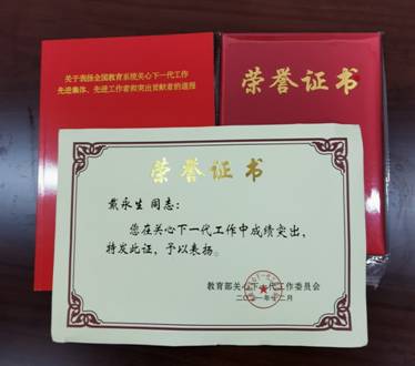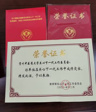 党建思政 党建工作> 大学生思政网> 党建思政 党建工作 大学生思政网 上一篇:《法律援助法》宣传在行动 谱写法律援助志愿者服务... 下一篇:学校与5地政府签署校地合作协议 建功新时代 五老立新功 2021.12.24 21:58:33 关工委 12月22日,“教育部关工委第六次工作会议暨成立30周年纪念大会”通过电视视频会形式在北京召开。会上对教育部30年来的工作进行了总结,同时对30年来对关工委工作出突出贡献的先进集体现和个人进行了表扬。 经过层层评选,我校关工委集体和个人榜上有名: 我校关工委荣获“全国教育系统关心下一代工作先进集体”; 我校中医临床一院关工委副主任戴永生荣获“全国教育系统关心下一代工作先进工作者”。