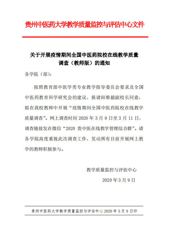 党建思政 党建工作> 大学生思政网> 党建思政 党建工作 大学生思政网 上一篇:我校思政课青年教师教学竞赛圆满举办 下一篇:关于开展疫情期间全国中医药院校在线教学质量调查... 关于开展疫情期间全国中医药院校在线教学质量调查(教师版)的通知 2020.12.21 09:20:12 教评中心