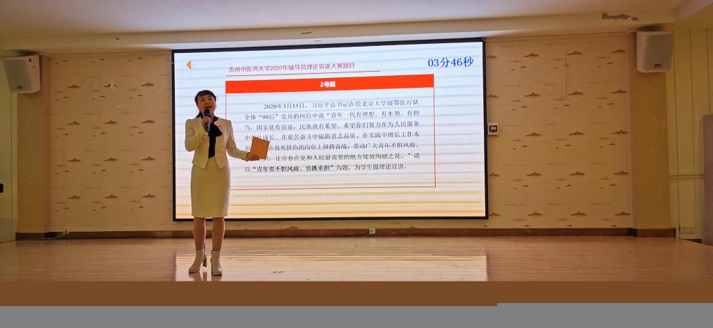 本次大赛主要围绕习近平新时代中国特色社会主义思想、党的十九届五中全会精神、“十三五”规划目标、中华民族伟大复兴、战“疫”精神和大学生理想信念教育、中国特色社会主义和中国梦宣传教育、社会主义核心价值观教的宣讲展开,选手们围绕“奋发有为进入新发展阶段,实现中华民族伟大复兴进程的大跨越”“青年要不惧风雨、勇挑重担”“坚持四个自信,走好中国特色社会主义道路”“弘扬抗疫精神,做勇担使命的贵中医人”四个主题,结合自身对国家方针政策、政治理论、重要会议精神的理解和领悟,灵活运用当前社会热点、国内外时事,通过讲政策、讲理论、讲案例的方式,为师生展示了一场灵活生动、内容丰富的思想政治理论课。他们“小角度讲清大道理,身边事讲好硬道理”的新颖理论教育方式和赛场上精彩的表现,获得了现场评委及师生的一致好评。