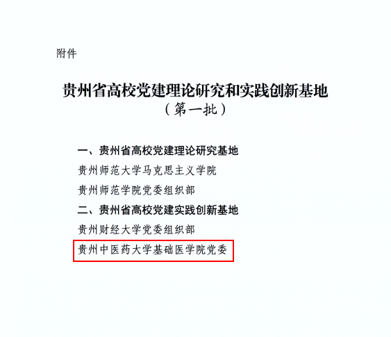 党建思政 党建工作> 大学生思政网> 党建思政 党建工作 大学生思政网 上一篇:[黔西南日报]陈大业:拄着拐杖去扶贫 下一篇:[多彩贵州网]365英国上市公司(集团)官方网站药学院第十四届中药知... 我校基础医学院党委入选贵州省高校党建实践创新基地(第一批) 2020.12.09 12:59:28 党委组织部 近日,省委教育工委下发《关于筹建贵州省高校党建理论研究和实践创新基地的通知》,公布了贵州省高校党建理论研究和实践创新基地(第一批)名单,我校基础医学院党委入选贵州省高校党建实践创新基地(第一批)。 据悉,此次筹建贵州省高校党建理论研究和实践创新基地工作,共有39家单位申报,省委教育工委最终评选出2个贵州省高校党建理论研究基地和2个贵州省高校党建实践创新基地。我校基础医学院党委入选贵州省高校党建实践创新基地,这充分体现了省委教育工委对我校近年来党建实践效果和党建工作创新的充分认可。