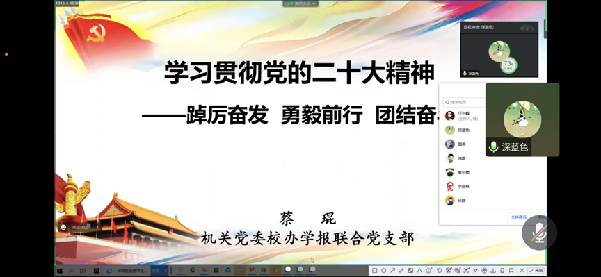 12月15日,校办学报联合党支部书记蔡琨以《踔厉奋发 勇毅前行 团结奋斗》为题,通过线上会议为支部党员宣讲党的二十大精神。