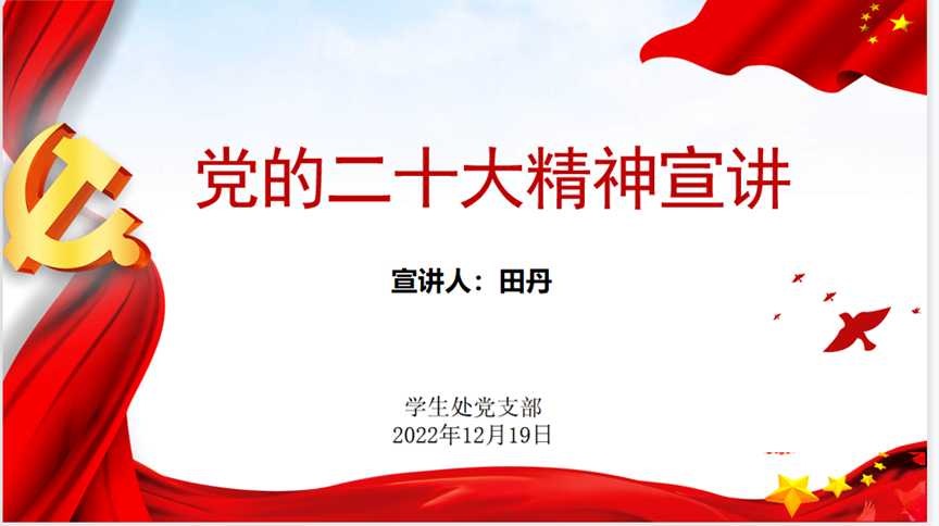 12月19日,学生处党支部书记田丹在支部开展党的二十大精神宣讲活动,支部全体党员参加。