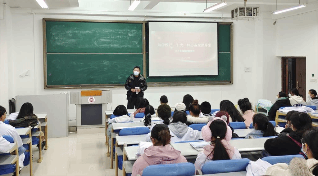 除党委班子成员作宣讲外,中医养生学院还组织辅导员教师深入课堂,面向学生广泛宣讲党的二十大精神。