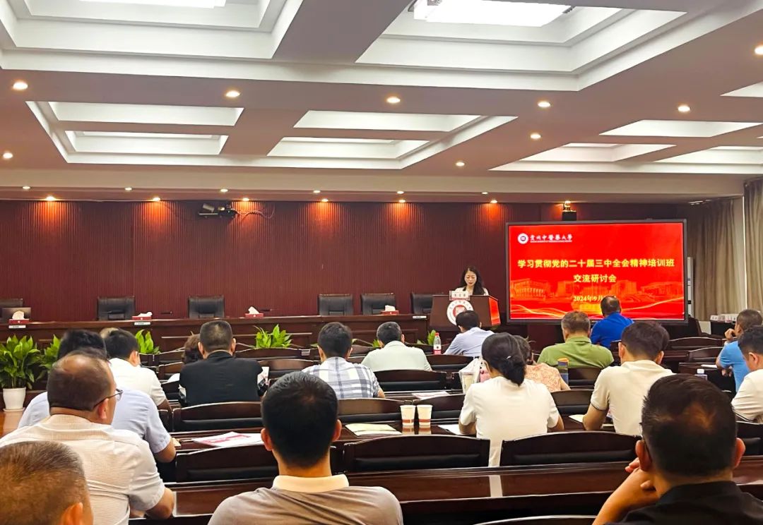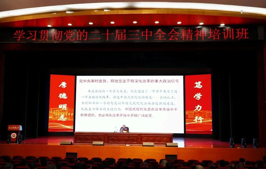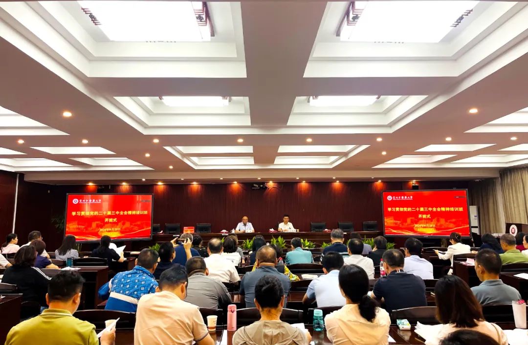 9月25日至27日,校党委在花溪校区行政楼会议室、礼堂采取线上线下相结合的方式,举办深入学习贯彻党的二十届三中全会精神培训班。全校党员、干部参加培训。
