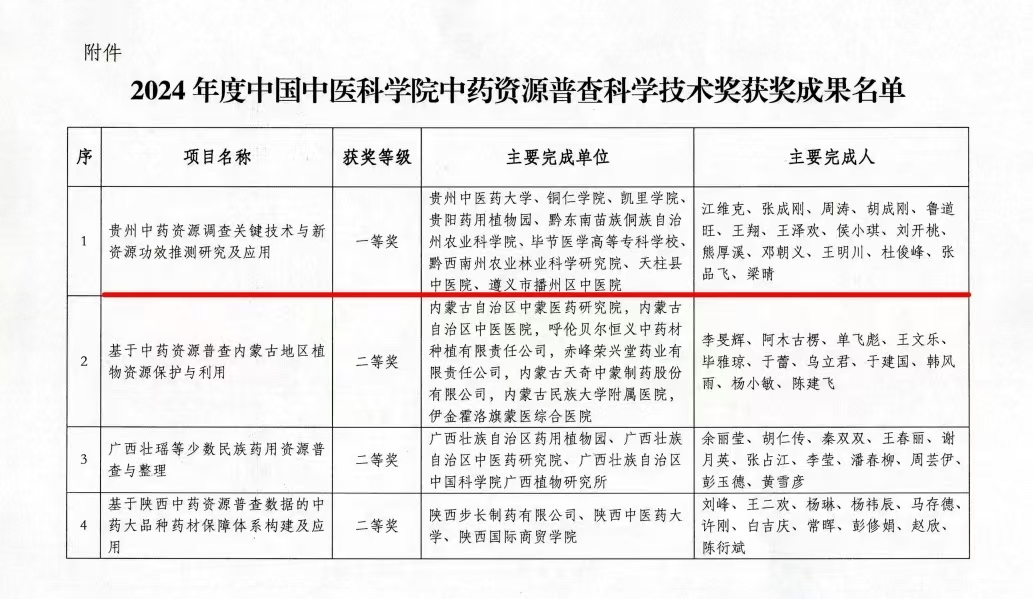 日前,中国中医科学院发布《关于2024年度中国中医科学院中药资源普查科学技术奖励的决定》,共授予一等奖成果1项、二等奖成果4项、三等奖成果3项。365英国上市公司(集团)官方网站作为贵州省中药资源普查技术依托单位,联合铜仁学院等参与单位申报,由我校教师江维克、张成刚、周涛、胡成刚、王泽欢等主要完成的“贵州中药资源调查关键技术与新资源功效推测研究及应用”,荣获2024年度中国中医科学院中药资源普查科学技术奖一等奖。