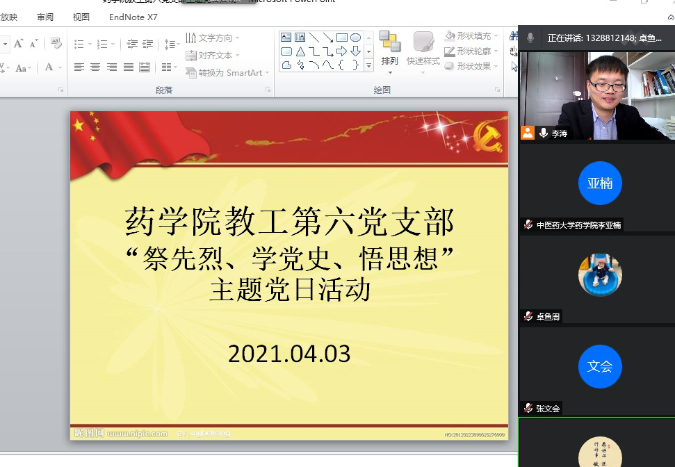4月3日,药学院党委通过线下与线上相结合的方式开展“祭英烈、学党史、悟思想”主题党日活动。全体党员同志通过实地祭扫烈士墓、“贵阳文明网 ”“中华英烈网”线上祭拜英烈等活动形式祭奠英烈,并通过天眼新闻APP、动静贵州、学习强国等网络资源学习革命先烈的英雄事迹。党员同志们纷纷表示,要在祭英烈、学党史过程中升华思想,明确学党史的现实意义,学会思考如何将党史学习与提升工作能力融为一体,办实事解民忧,送技术促振兴,以优异成绩迎接建党一百周年。