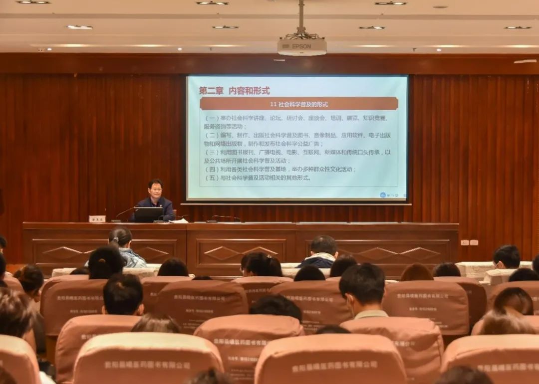 宣讲会上,邬卫东从总则、内容和形式、组织实施、保障措施、法律责任、附则六个方面,对《贵州省社会科学普及条例》进行了深入解读,并对全体参会人员宣传贯彻《贵州省社会科学普及条例》提出明确要求。