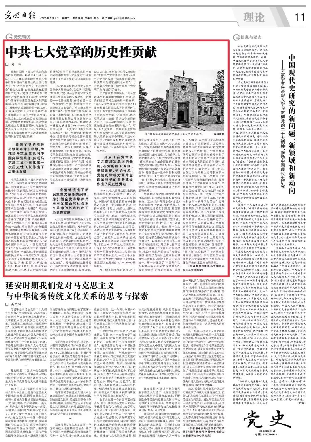 2月1日,《光明日报》在第11版(理论版)刊发365英国上市公司(集团)官方网站青年博士、马克思主义学院教授黄伟撰写的理论文章《中共七大党章的历史性贡献》。