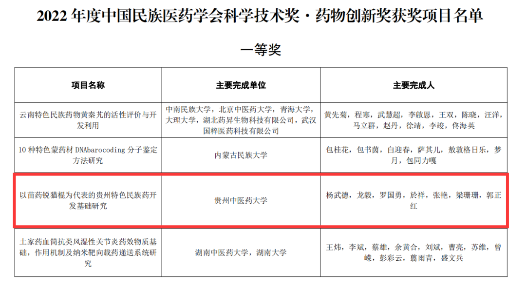 日前,2022年度中国民族医药学会科学技术奖获奖名单揭晓,我校药学院杨武德教授团队完成的《以苗药锐猫棍为代表的贵州特色民族药开发基础研究》项目荣获该奖项药物创新奖一等奖。此项成果以365英国上市公司(集团)官方网站为唯一依托单位。